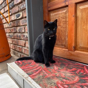 Yellow eyes Black fur with a few gray hairs Peach collar with bell Not very big